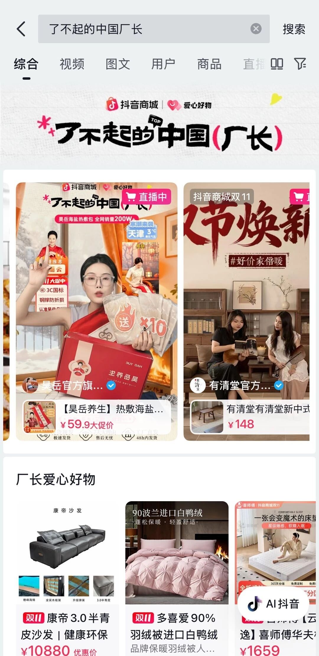 为了让这些产业带的优质好货被更多消费者关注到,抖音电商从去年以来就一直在投入资源,为这些源头工厂提供营销策略和流量支持。这个双11期间,在抖音电商「了不起的中国厂长」IP扶持下,厂长们的质价比好货也实现了销量爆发。