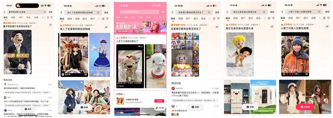 核心话题#万物皆可毛茸茸 、#毛茸茸才是小雪的仪式感、#这个冬天要茸里茸气 强势登陆抖音全国榜TOP5,成为全民讨论的焦点;垂类话题#一到冬天我的手机壳就融化了、#入冬了我也要穿毛茸茸的小狗袜 、#毛茸茸文创已经next level 等精准戳中兴趣点,一边让大众心动破圈,一边带动毛茸茸商品成交;同时,#董宇辉安徽行毛茸茸地官宣了 、#世界冠军都来毛茸茸了、#误入了毛茸茸的疯狂动物城 等话题纷纷借势幽默玩梗,毛茸茸热度进一步发酵,持续为内容场与消费场输送热度。